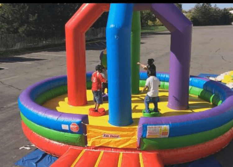 (4) Players climb atop their inflated pads. One of the players grabs the Wrecking Ball and hurls it at their opponent in an attempt to knock the player off of their inflated pad. As the Wrecking Ball swings back, try and grab it! The player, who grabs it first, then hurls it at another player, trying to knock that player off. The last player standing is the champion! This is sure to catch the eyes of the crowd!!