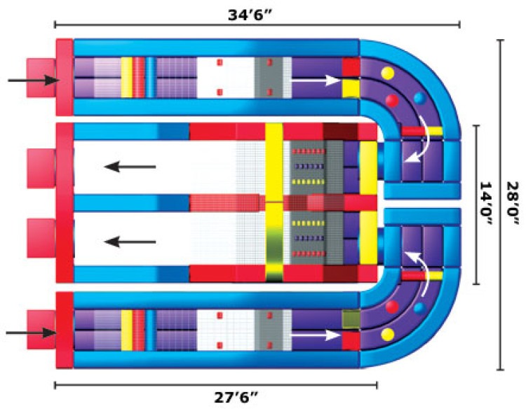 Participants enter through the front of the outside modules and progress their way through a challenging combination of log crawls, rock climbs, slides, crawl tubes before they climb to the top of the rock wall and slide out to the exit.
